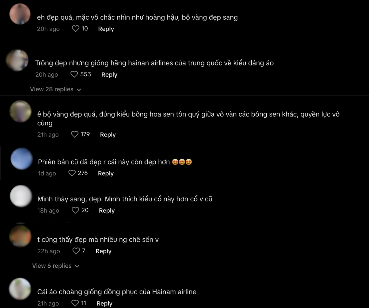 Trích bình luận của 1 netizen chia sẻ: "Nhà thiết kế muốn tôn vinh vẻ đẹp của người phụ nữ, thể hiện nhiều tầng ý nghĩa mà quên rằng tính ứng dụng mới là điều cần thiết nhất. Nếu tiếp viên hàng không phải mặc trang phục như thế này thì thật sự thương cho các bạn. Cảm ơn bạn đã mang đến thiết kế này, nhưng còn phải cố gắng và điều chỉnh thêm rất nhiều."