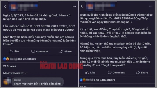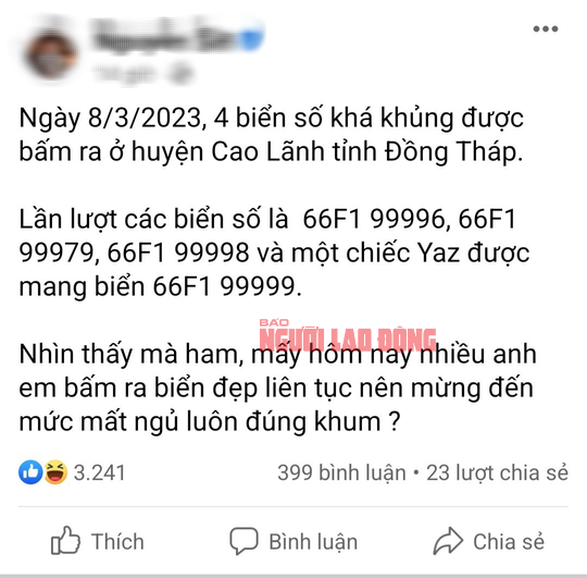 Trước đó, tối 31-3, một tài khoản Facebook lan truyền thông tin: "Ngày 8-3, tại huyện Cao lãnh, tỉnh Đồng Tháp, lần lượt các biển số là 66F1- 999.96, 66F1-999.79, 66F1-999.98 và biển 66F1-999.99. Nhìn thấy mà ham, mấy hôm nay nhiều anh em bấm ra biển số đẹp liên tục, nên mừng đến mức mất ngủ luôn đúng khum?".
