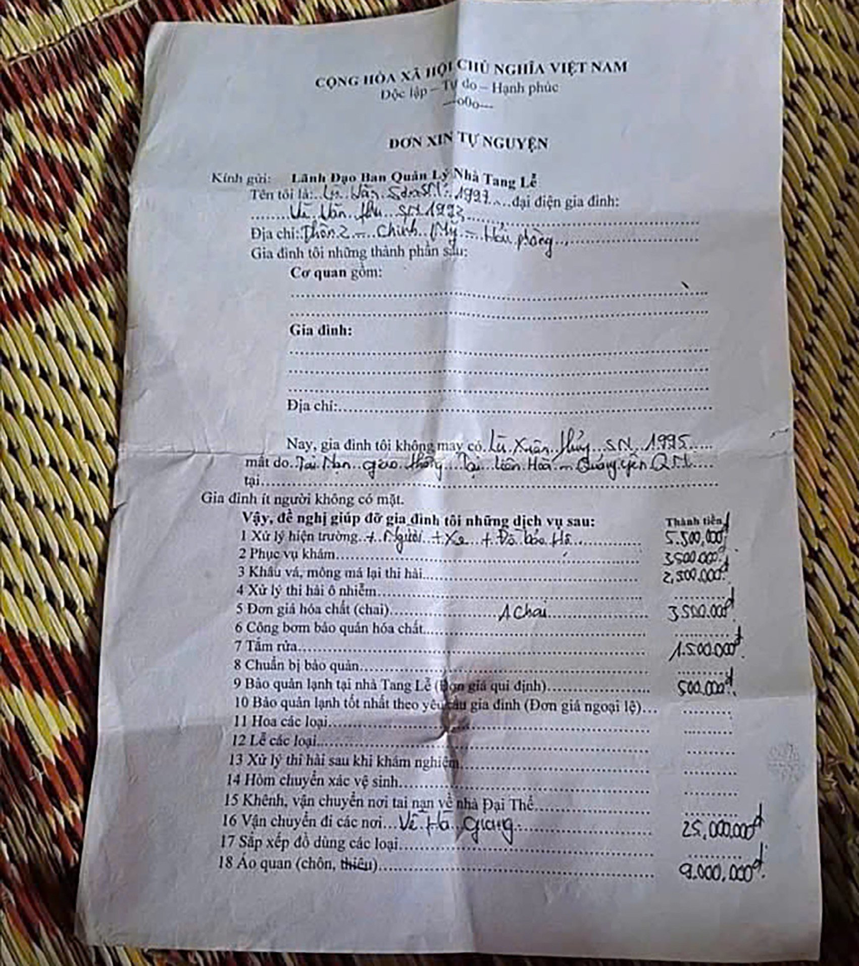 Theo thông tin từ phía gia đình, trong lúc bối rối, họ tưởng chi phí trọn gói là 25 triệu đồng mỗi nạn nhân. Tuy nhiên, khi xe đã lăn bánh, gia đình mới "ngã ngửa" khi biết tổng chi phí cho hai người là gần 120 triệu đồng. Cụ thể, hóa đơn của một nạn nhân liệt kê hàng loạt khoản phí như: xử lý hiện trường và đồ bảo hộ (5,5 triệu), vận chuyển (25 triệu), áo quan (9 triệu), khâu vá thi hài (2,5 triệu), cùng nhiều khoản chi nhỏ lẻ khác như chậu, khăn mặt, bát cơm, quả trứng... Tổng cộng một hóa đơn là hơn 62 triệu đồng.