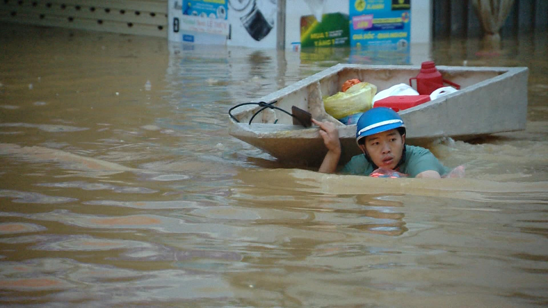 "Người đàn ông trong ảnh khoẻ mạnh nhất của một gia đình có 7 người. Anh đang bơi đến xuồng cứu trợ để nhận mì tôm và một số đồ dùng thiết yếu. Gia đình anh có người mới sinh cháu được hơn một tháng. Xuồng cứu trợ không đủ vào từng nhà dân để tiếp tế.