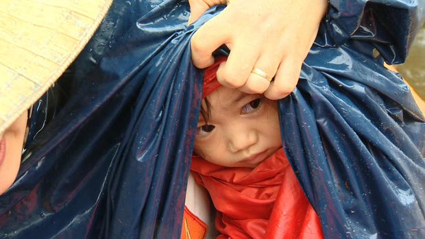 Trên hành trình theo chân đội cứu hộ, phóng viên VTV cũng đã ghi lại được hình ảnh của 1 em bé, ngồi thu lu trong lòng người lớn dưới cơn mưa xối xả, được "gói bọc" trong nhiều lớp áo mưa.
