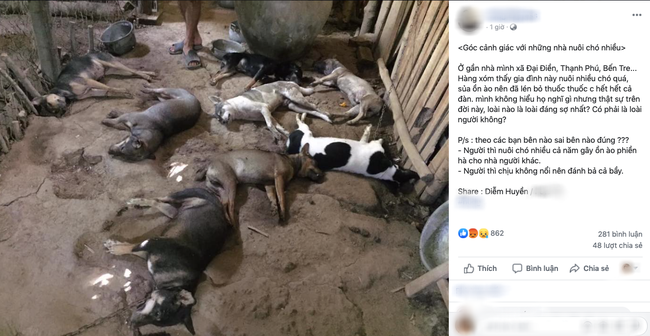 Nội dung bài chia sẻ: "Ở gần nhà mình xã Đại Điền, Thạnh Phú, Bến Tre... Hàng xóm thấy gia đình này nuôi nhiều chó quá, sủa ồn ào nên đã lén bỏ thuốc thuốc chết hết cả đàn.