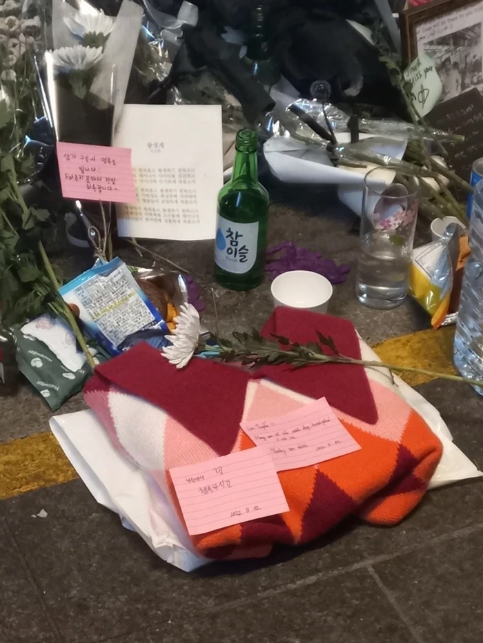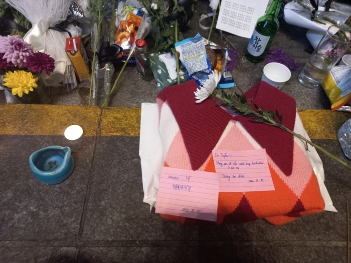 Chiếc áo len được gấp gọn gàng, đặt cạnh giữa muôn vàn bó hoa tưởng niệm những người đã khuất. Bên trên đặt lên một bông hoa cùng lời nhắn bằng cả tiếng Việt và tiếng Hàn đầy xúc động. Có lẽ ai đó là đồng bào người Việt đã đến đây gửi lời cô gái sinh năm 2001 những lời tiễn biệt sau cuối. Hy vọng rằng dù không may ra đi ở nơi đất khách quê người, em sẽ không cô đơn.