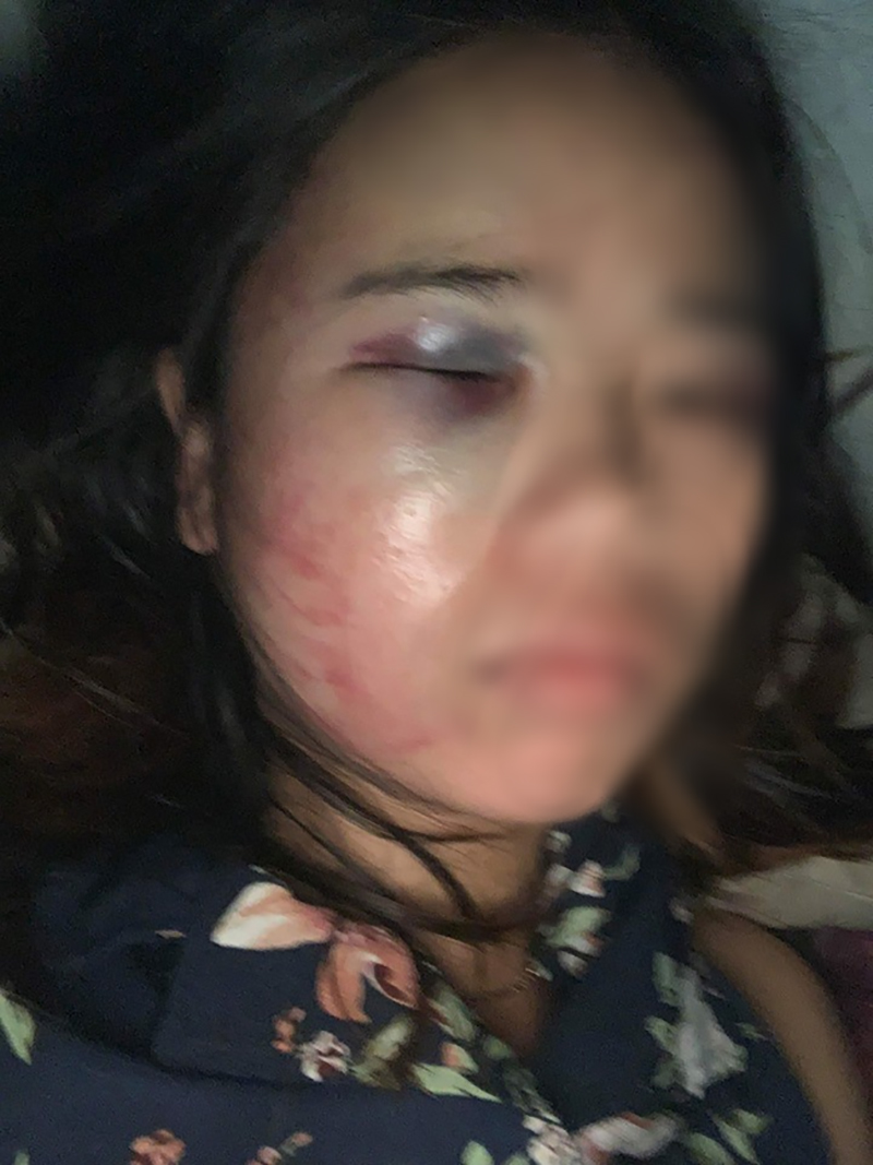 Đính kèm những dòng chia sẻ trong nước mắt là hình ảnh khuôn mặt Mỹ Tr. bị đánh đập, chảy máu, đỏ rát và sưng tấy, mặc dù chị đang mang thai.