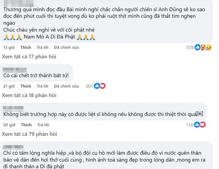 “Thương quá mình đọc đầu bài mình nghĩ chắc chắn người chiến sĩ anh dũng sẽ không sao, đọc đến phút cuối thì tuyệt vọng dù ko phải ruột thịt mình cũng đã thắt tim nghẹn ngào. Chúc cháu yên nghỉ về với cõi phật nhé”.