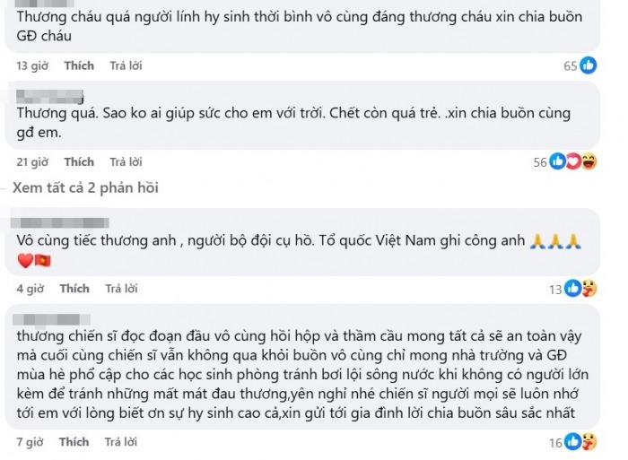 “Thương chiến sĩ đọc đoạn đầu vô cùng hồi hộp và thầm cầu mong tất cả sẽ an toàn vậy mà cuối cùng chiến sĩ vẫn không qua khỏi buồn vô cùng. Chỉ mong nhà trường và gia đình mùa hè phổ cập cho các học sinh phòng tránh bơi lội sông nước khi không có người lớn kèm để tránh những mất mát đau thương. Yên nghỉ nhé chiến sĩ người mọi sẽ luôn nhớ tới em với lòng biết ơn sự hy sinh cao cả, xin gửi tới gia đình lời chia buồn sâu sắc nhất”.