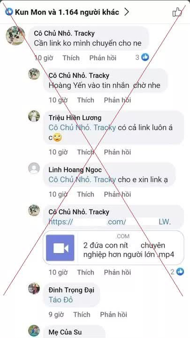 Bên cạnh đó, trong một bài viết của tài khoản "Kun Mon", M. cũng đã bình luận nội dung "Cần link ko mình chuyển cho ne". Sau đó, M. phát tán công khai đường dẫn tới website có video 2 trẻ vị thành niên quan hệ tình dục.