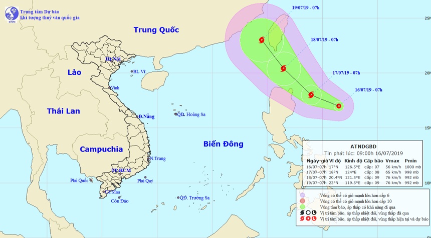 Đến 7 giờ ngày 19/7, vị trí tâm bão ngay trên vùng biển phía Tây Nam đảo Đài Loan. Sức gió mạnh nhất vùng gần tâm bão mạnh cấp 8-9 (60-90km/giờ), giật cấp 11.