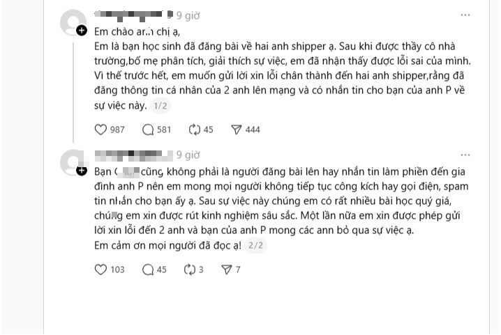 Trong bài viết, chủ tài khoản cho biết mình là học sinh đã đăng bài phản ánh sự việc trước đó, đồng thời khẳng định không phải người tên C. như nhiều thông tin lan truyền trên mạng. Người này cho biết sau khi được thầy cô và gia đình phân tích, giải thích, bản thân đã nhận ra sai sót và muốn gửi lời xin lỗi tới hai shipper vì đã đăng thông tin cá nhân của họ lên mạng.