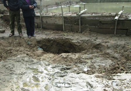 "Hố tử thần” tại ao cá nhà ông Loan có đường kính hơn 4 m, điểm sụt lún sâu có hình bầu dục và có độ sâu khoảng 10 m.
