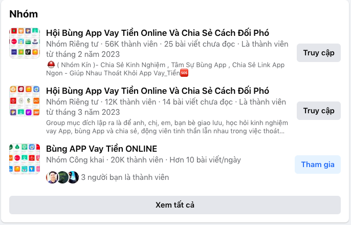 Một trong những hội nhóm nổi bật như Hội bùng app vay tiền và chia sẻ cách đối phó; Hội bùng app vay tiền online và chia sẻ cách đối phó; Hội bùng app vay tiền online; Hội bùng app vay tiền và cách đối phó 2023...