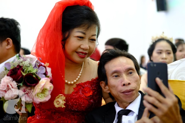 Vì sức khỏe không cho phép, bản thân có vấn đề ở đường hô hấp nên sau khi chụp một loạt tấm hình "hấp hôn", cụ Bé đã phải bỏ váy cưới ra để mặc quần áo bình thường cho thoải mái. Dù mệt nhưng sự rạng rỡ luôn giữ trên môi cặp đôi lớn tuổi này.