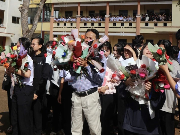Ngày 31/10, trên mạng xã hội xuất hiện clip ghi lại hình ảnh học sinh Trường THPT Phan Chu Trinh (huyện Ea H'leo) tổ chức lễ chia tay thầy hiệu trưởng Hoàng Minh Ngọc sau 9 năm gắn bó.
