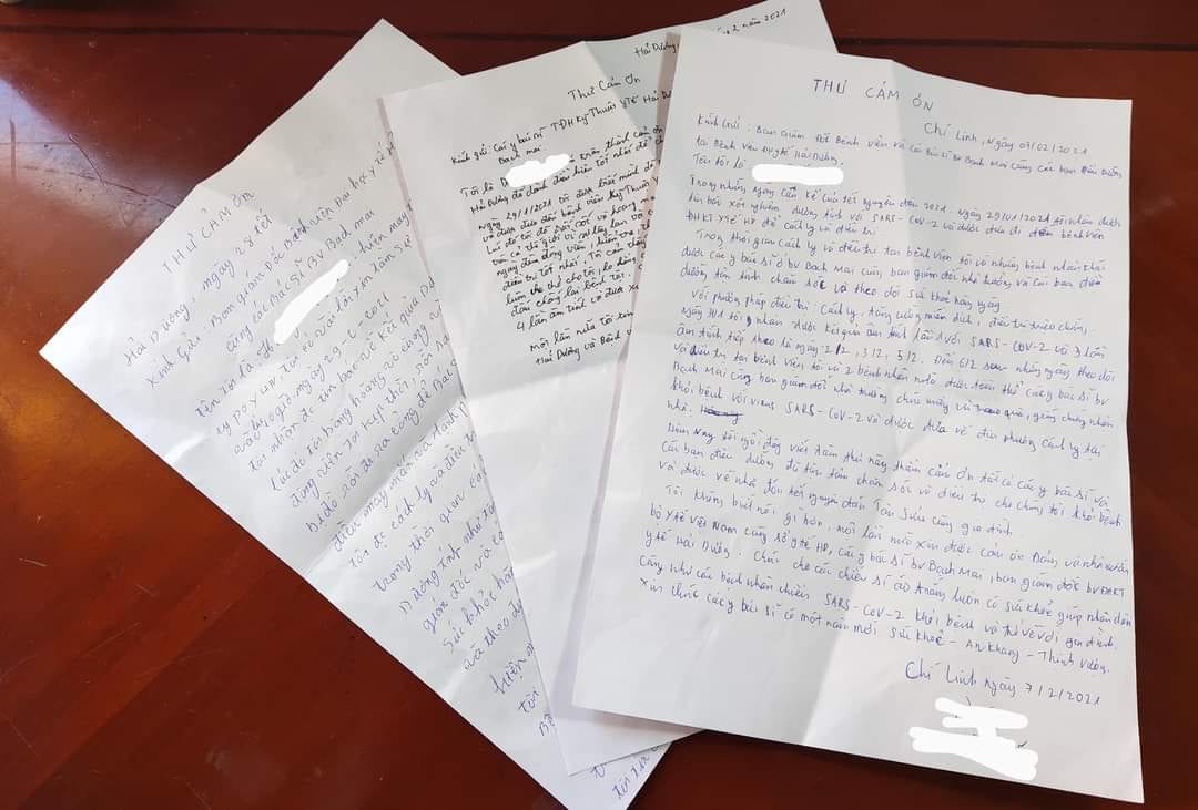 Ba bệnh nhân được công bố khỏi bệnh tại Hải Dương vào ngày 6/2 là BN1664, BN1665, BN1669. Chia sẻ về lý do viết thư gửi các y bác sĩ, bệnh nhân H.T.H. (sinh năm 1974, TP. Chí Linh, Hải Dương) chia sẻ: “Thời gian điều trị tại bệnh viện chúng tôi được các y bác sĩ chăm lo đến từng bữa ăn, giấc ngủ. Giờ khỏi bệnh rồi, tôi muốn gửi vài dòng tâm sự đến họ để bày tỏ lòng biết ơn của mình. Đây cũng như là một món quà năm mới tri ân đến những người mà chúng tôi biết ơn”.