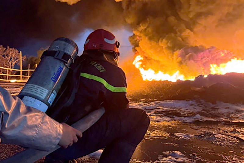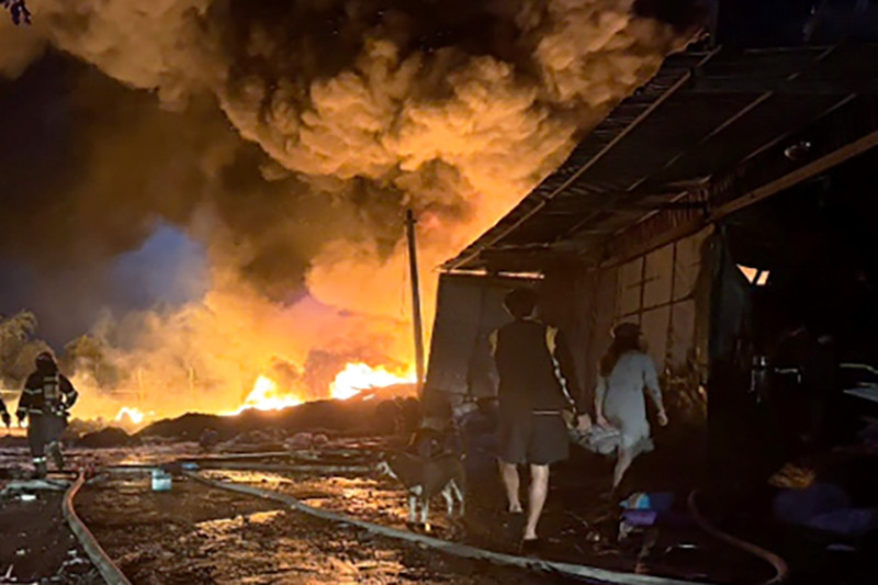 Tại hiện trường, lực lượng chức năng xác định, khu vực xảy ra cháy là xưởng tái chế nhựa, có quy mô 1 tầng, kết cấu khung thép mái tôn với diện tích khoảng 500m2. Tình hình đám cháy phức tạp, nhiều vật liệu dễ cháy, phát sinh khói, khí độc và có khả năng cháy lan sang các khu vực nhà xưởng, kho lân cận…
